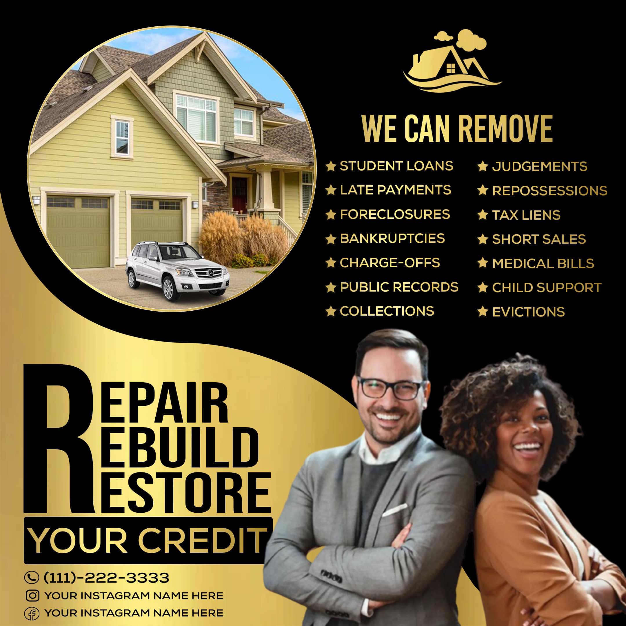 Download Credit Rebuild Flyer Free Template. This Flyer PSD is for credit agents, Instagram advertisements. It is suitable for any kind of business, webinar, online advertising purposes. This Credit Flyer Free Template contains a 1080×1080 size, 300 dpi, RGB, PSD file. All main layers are editable and customizable, you can change the color and content using Adobe Photoshop according to your theme.