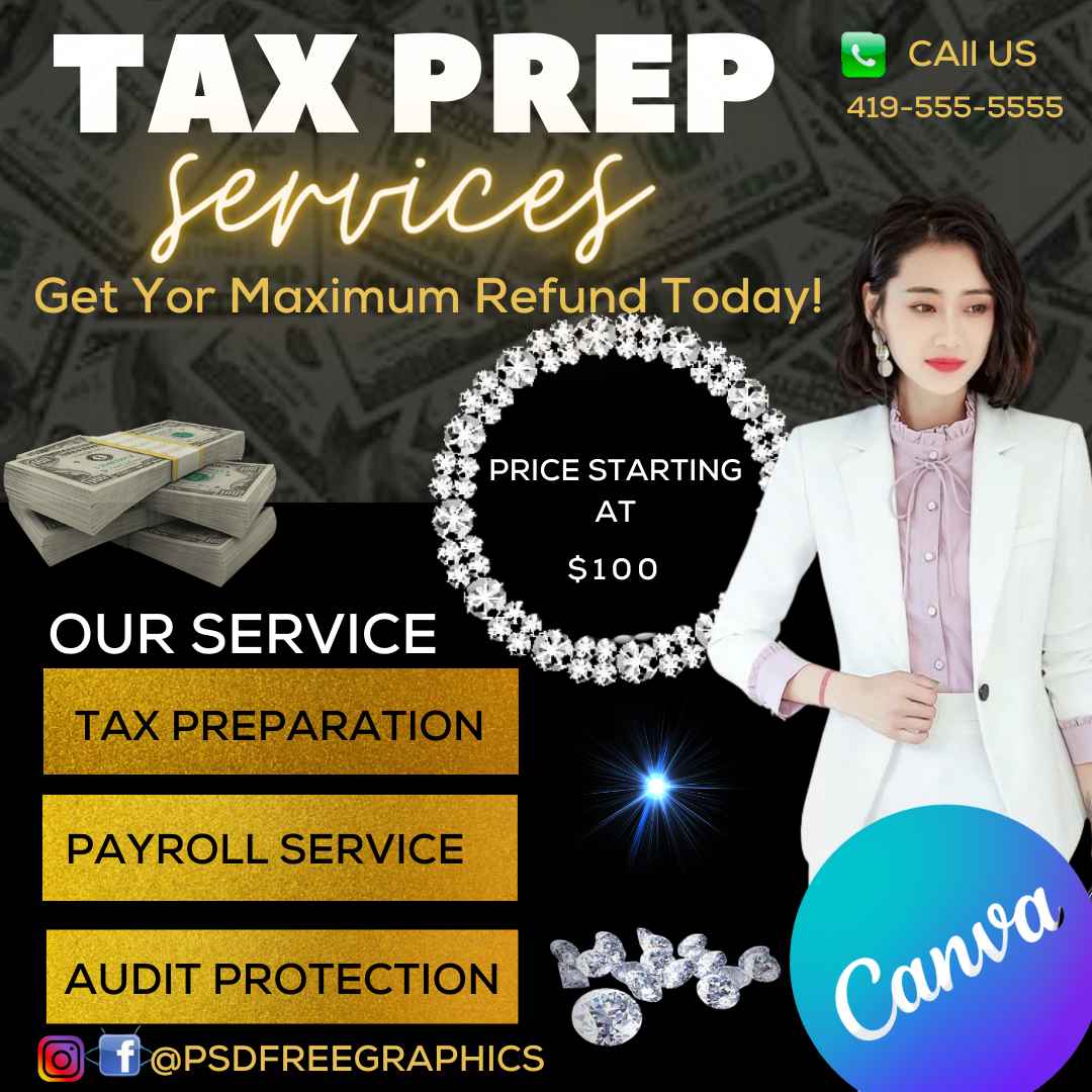 Download and Edit Free Tax Prep Service Flyer. This Tax Flyer is suitable for any kind of business, credit agents, tax prep services, and zoom meetings. You can use this Tax Prep Flyer Template for traditional advertising, print magazine, newspaper ads, and promotional posters. The Flyer Template is easy to edit and customizable. You can change it with your own details using Canva. Simply add your images and text.